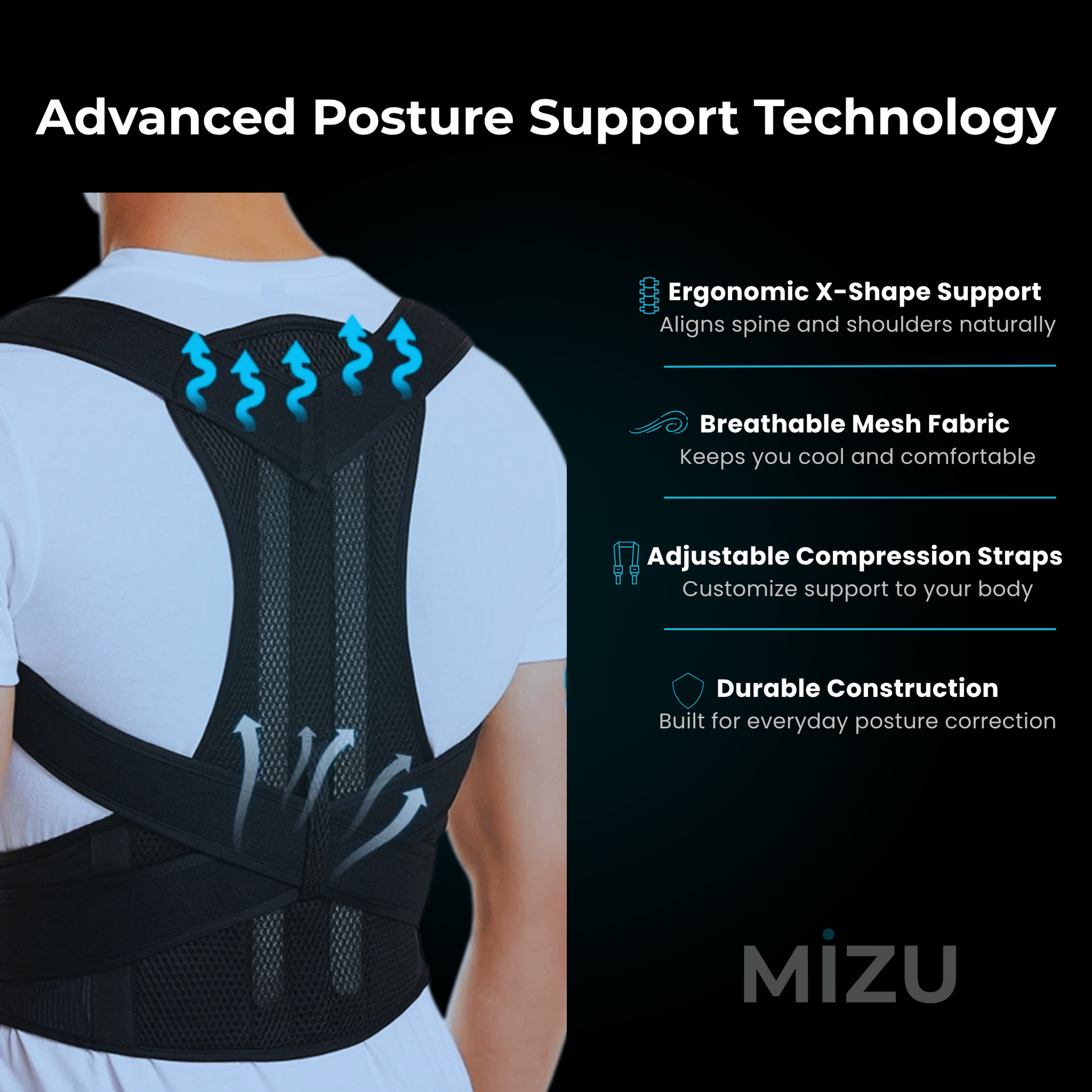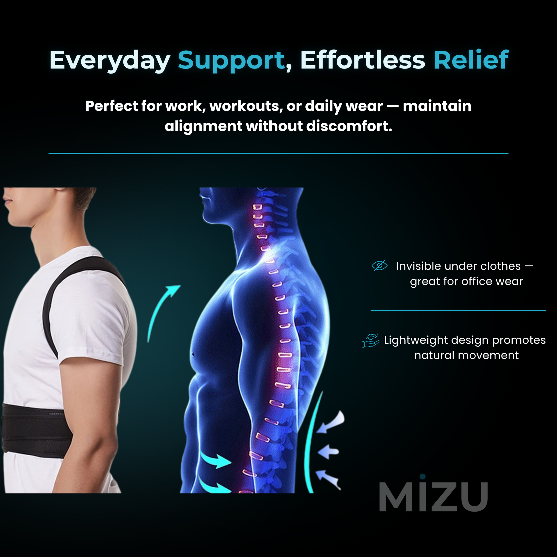 The Mizu Posture Restore Brace is designed to gently align your spine, improve posture, and reduce discomfort from slouching or scoliosis. Made with breathable, lightweight materials and adjustable straps, it provides all-day comfort whether you’re working, studying, or recovering after training.